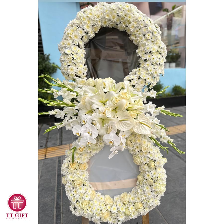 This luxury standing wreath flower features 30 white roses, 15 bunches of white chrysanthemums, 15 white gladiolus stems, 10 white oriental lilies, 10 white orchids, and 2 white anthuriums. These premium and elegant flowers are beautifully arranged on a two-tier stand with a sophisticated and striking design. This two-tier funeral wreath is available for delivery in most cities across Iran for memorial and condolence ceremonies.