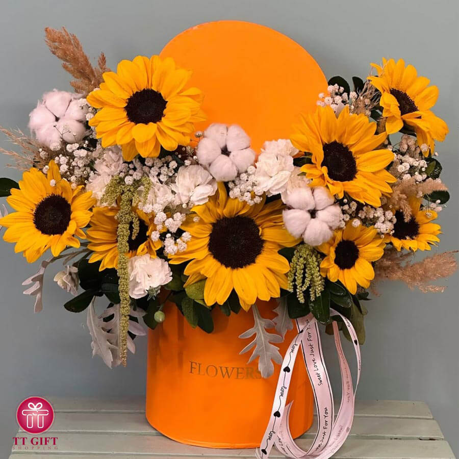 The Golsa flower box is designed and arranged with 10 sunflowers, 3 cotton flowers, and several gypsophila bunches inside an orange cylindrical box. This flower box is prepared and sent in Iranian cities for occasions such as birthdays, thanksgiving, and girls' day.