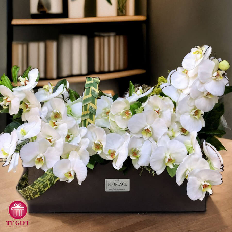 Nilsa luxurious flower box features 40 stems of elegant white orchids, beautifully arranged in a sleek black rectangular box. This stunning arrangement makes a perfect choice for occasions such as birthdays, appreciation, inaugurations, and even memorial services, and can be ordered in select cities across Iran.