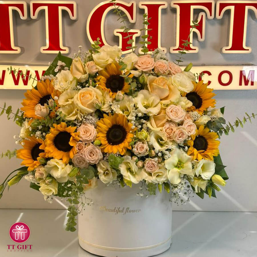 The flower box above includes 7 sunflower branches, 5 rose branches, 4 bunches of white lisianthus, 2 bunches of white miniature roses and 1 bunch of gypsophila, which are arranged and flowered inside a white cylindrical box. Sending a beautiful flower box for occasions such as birthdays, Mother's Day, and Daughter's Day is possible in most cities in Iran.