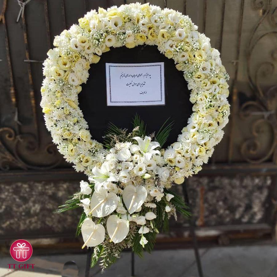 The Shaghayegh wreath flower arrangement features 8 bunches of white chrysanthemums, 8 bunches of white lisianthus, 4 white anthuriums, 3 stems of white oriental lilies, and several bunches of gypsophila, beautifully designed with elegant greenery. This funeral wreath is available for delivery in most cities across Iran for memorial and condolence ceremonies.