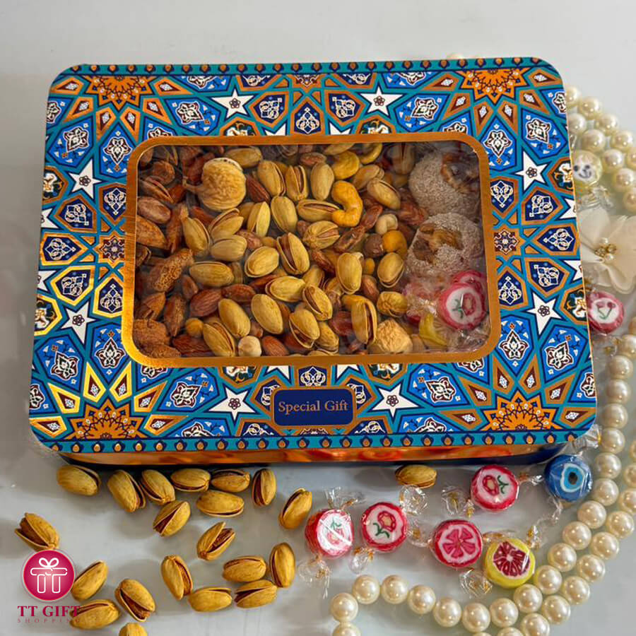 The above box of nuts contains about 500 grams of edible nuts and basloq and high-quality candies. You can present this delicious and attractive treat to your loved ones on various occasions as a gift for Yalda Night, Nowruz, Chaharshanbe Suri, etc. By ordering these nuts in Tehran and many cities in Iran, enjoy buying a delicious gift.