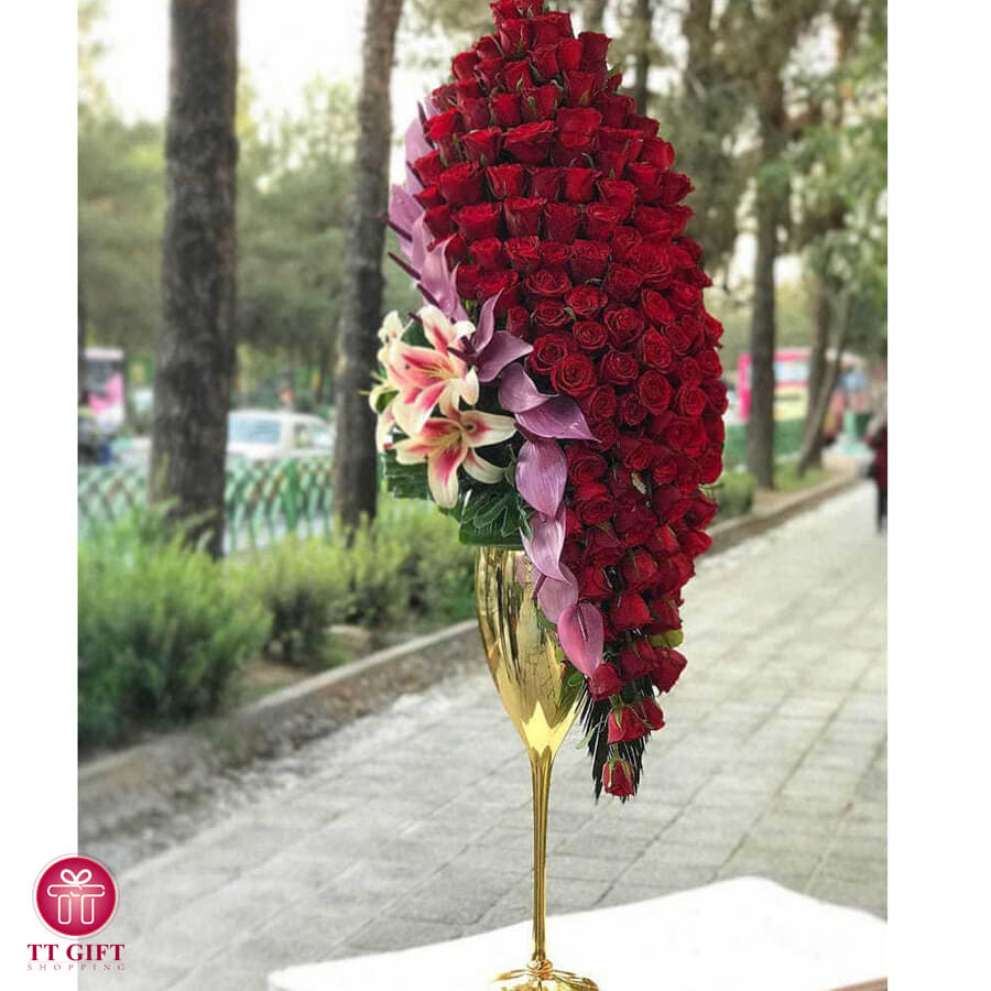 طراحی جام گل لاکچری آسلی شامل 120 شاخه رز قرمز، 15 شاخه آنتریوم بنفش و 4 شاخه لیلیوم اورینتال صورتی می‌باشد که داخل یک جام گل پایه‌دار زیبا به رنگ طلایی، به‌صورت یکطرفه گل‌آرایی شده است. جلوه‌ی باشکوه و لطیف این جام گل، آن را به انتخابی مناسب برای مراسم‌های رسمی مثل خواستگاری و افتتاحیه تبدیل کرده، که در بیشتر شهرهای ایران قابل ارسال می‌باشد.
