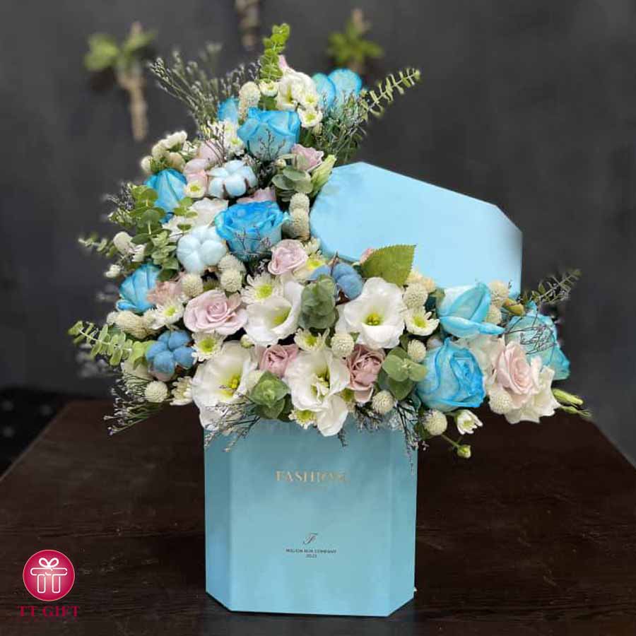 باکس گل لیسیانتوس و رز آبی و سفید ارزان عطرین