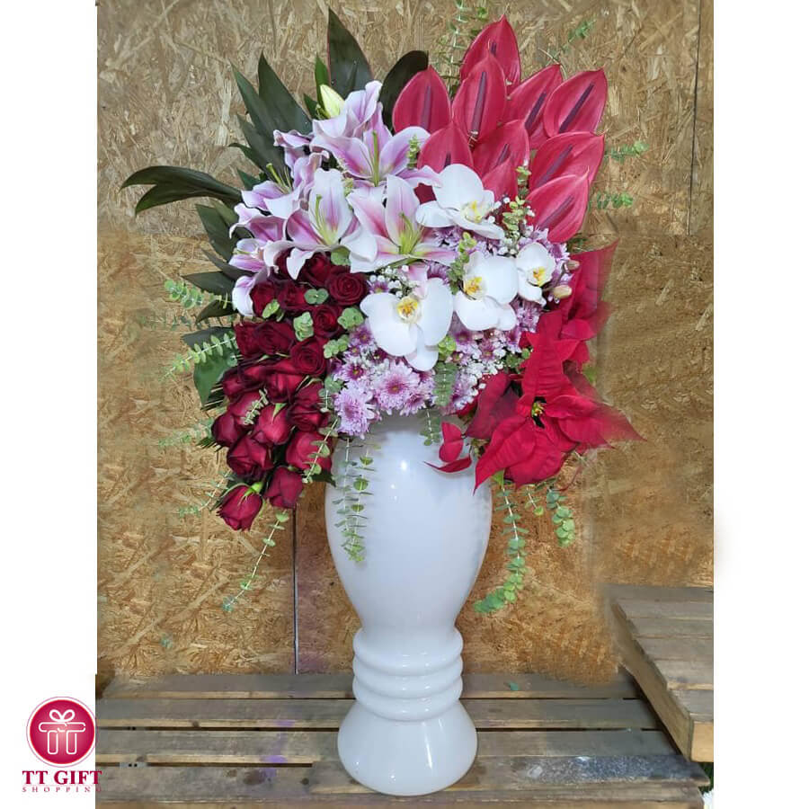 این گلدان گل زیبا با گل های آنتریوم، لیلیوم اورینتال، رز، ارکیده، داوودی و ژیپسوفیلیا با هنرمندی متخصصین تیم گل آرایی گلفروشی آنلاین تی تی گیفت،به زیباترین نحو ممکن چیدمان و تزیین شده اند.