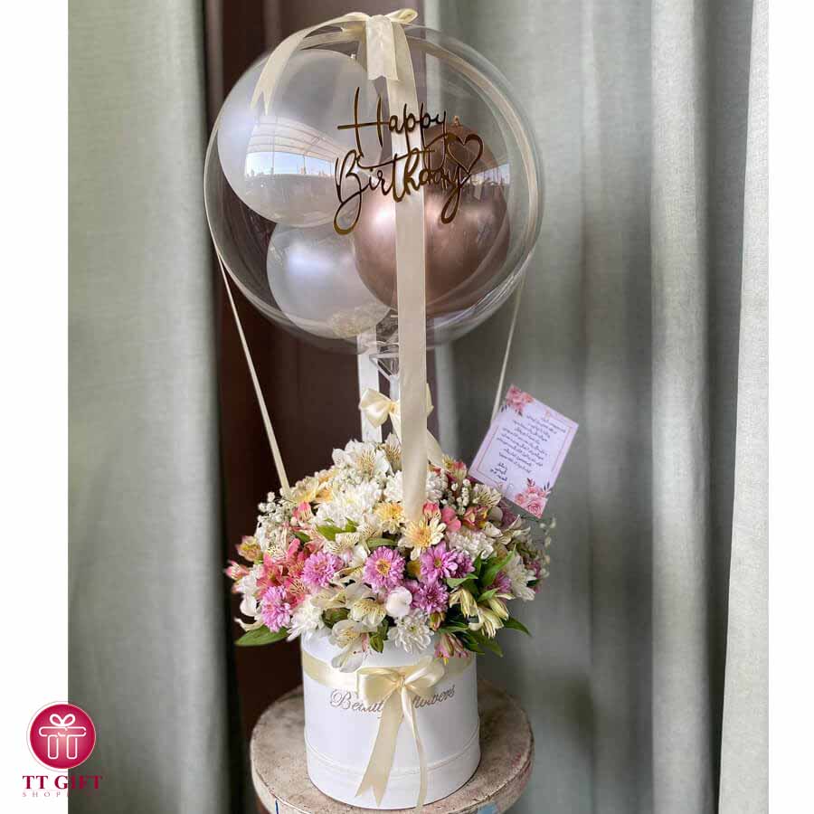 باکس گل داوودی و آلسترومریا کیان با بادکنک برای تولد
