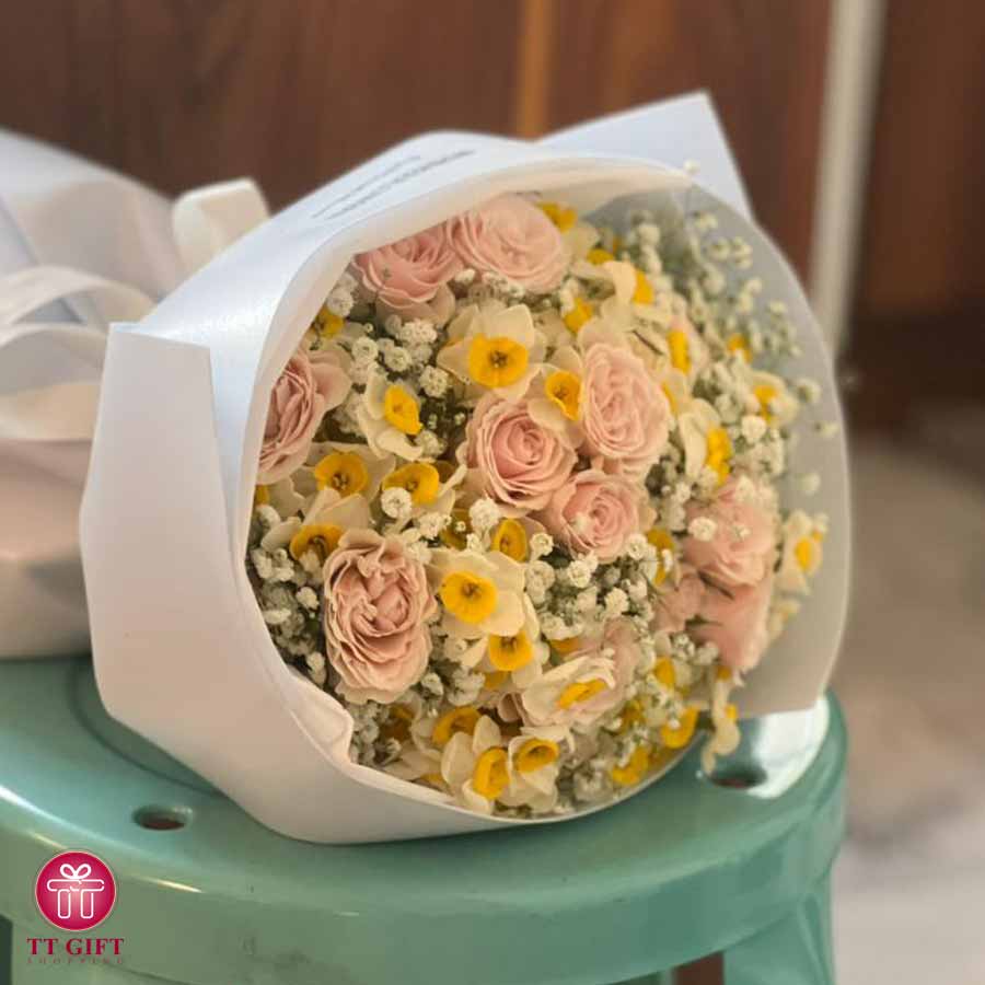 طراحی این دسته گل زیبا با گل‌های نرگس، رز مینیاتوری و ژیپسوفیلا انجام شده است. برای مناسبت‌هایی مثل تولد، روز مادر و روز پدر در تهران و کرج قابل سفارش می‌باشد.