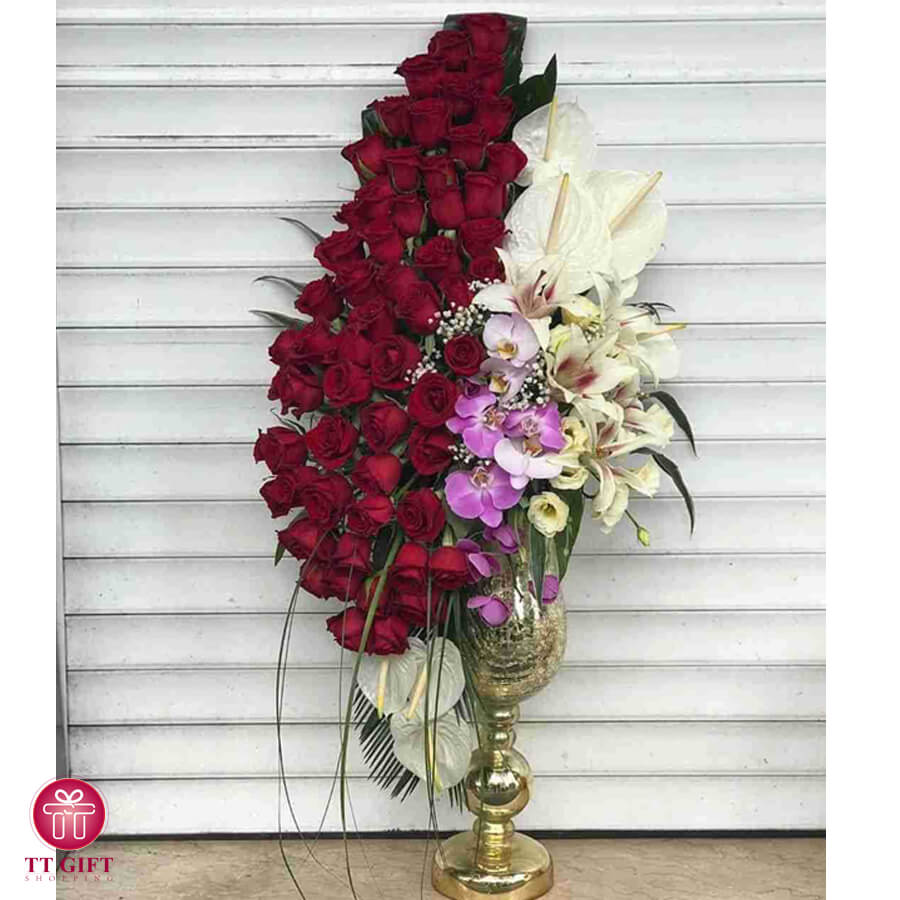 جام گل لاکچری پریا با تعداد 60 شاخه رز قرمز، 10 شاخه ارکیده بنفش، 7 شاخه آنتریوم سفید، 4 شاخه لیلیوم اورینتال، 1 دسته لیسیانتوس سفید و ژیپسوفیلا داخل یک جام گل پایه‌دار طلایی به‌صورت یکطرفه طراحی و گل‌آرایی شده است. جلوه‌ی باشکوه این جام گل، آن را به انتخابی مناسب برای مراسم‌های رسمی مثل خواستگاری، افتتاحیه و جشن‌های لاکچری تبدیل کرده و در بیشتر شهرهای ایران قابل ارسال می‌باشد.