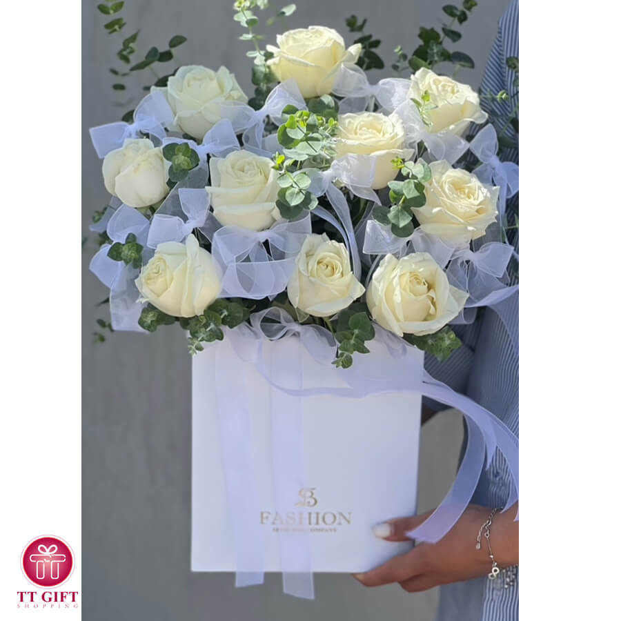 طراحی باکس گل روشا شامل 10 شاخه گل رز هلندی سفید، داخل باکس شیک می‌باشد. دیزاین گل‌ها با برگ‌های اکالیپتوس و پاپیون‌های کوچک سفید، زیبایی این باکس گل را چند برابر کرده است به‌عنوان هدیه تولد، تشکر، روز دختر و ... در برخی شهرهای ایران، سفارش داده می‌شود.