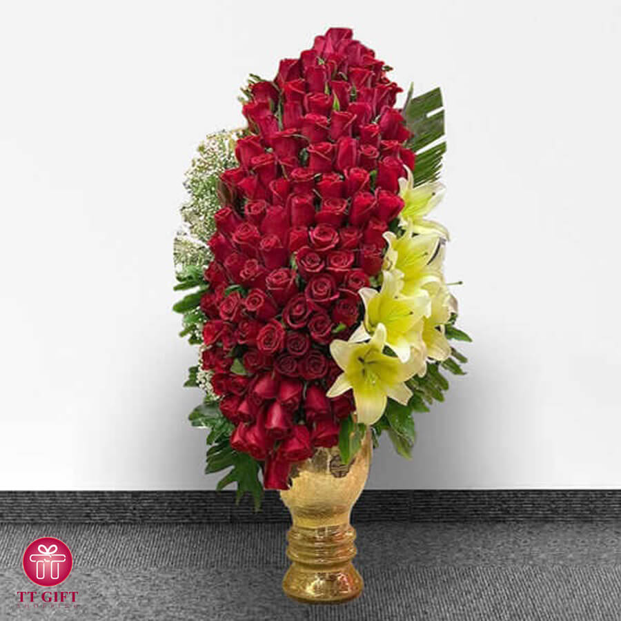 جام گل رز قرمز و لیلیوم اورینتال زرد لاکچری ساره