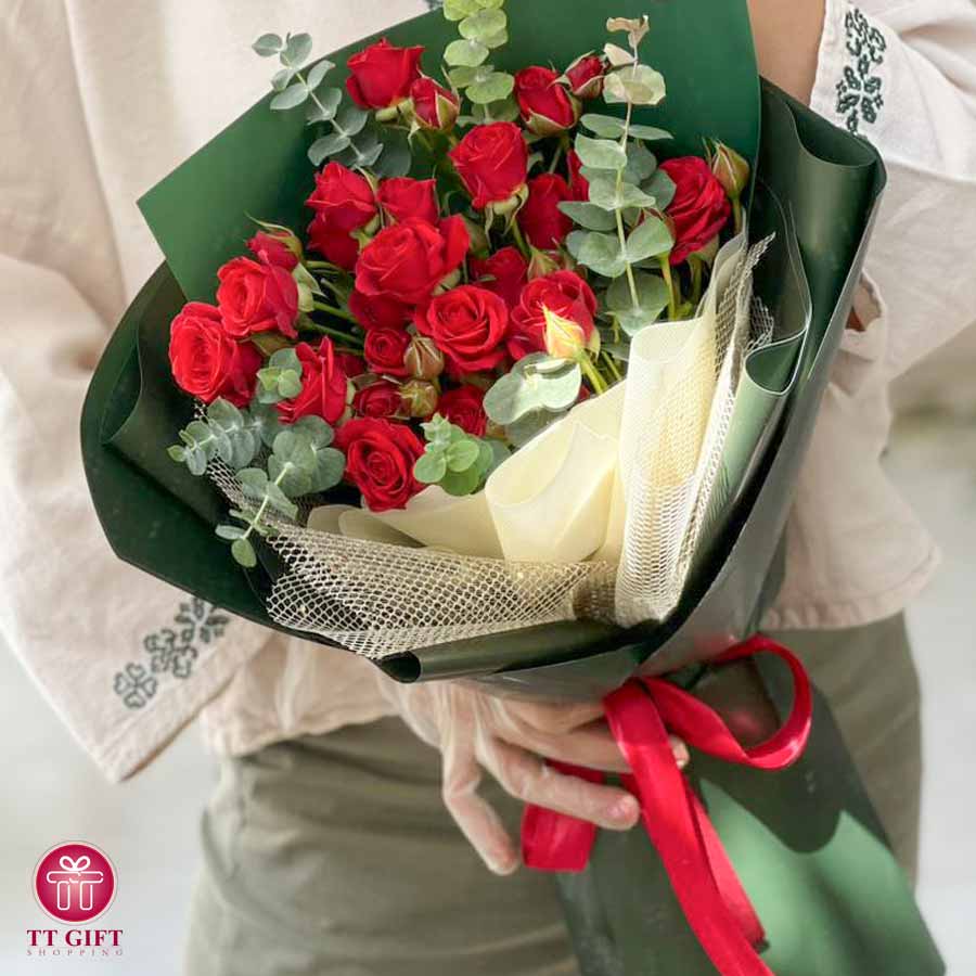 این دسته گل ارزان زیبا شامل 3 دسته گل رز مینیاتوری قرمز می‌باشد که با دیزاینی ساده و لطیف با برگ‌های اکالیپتوس و کاغذهای سبز مخصوص گل‌آرایی طراحی شده و در تهران و کرج برای مناسبت‌هایی مثل تولد، تشکر و ... سفارش داده می‌شود.