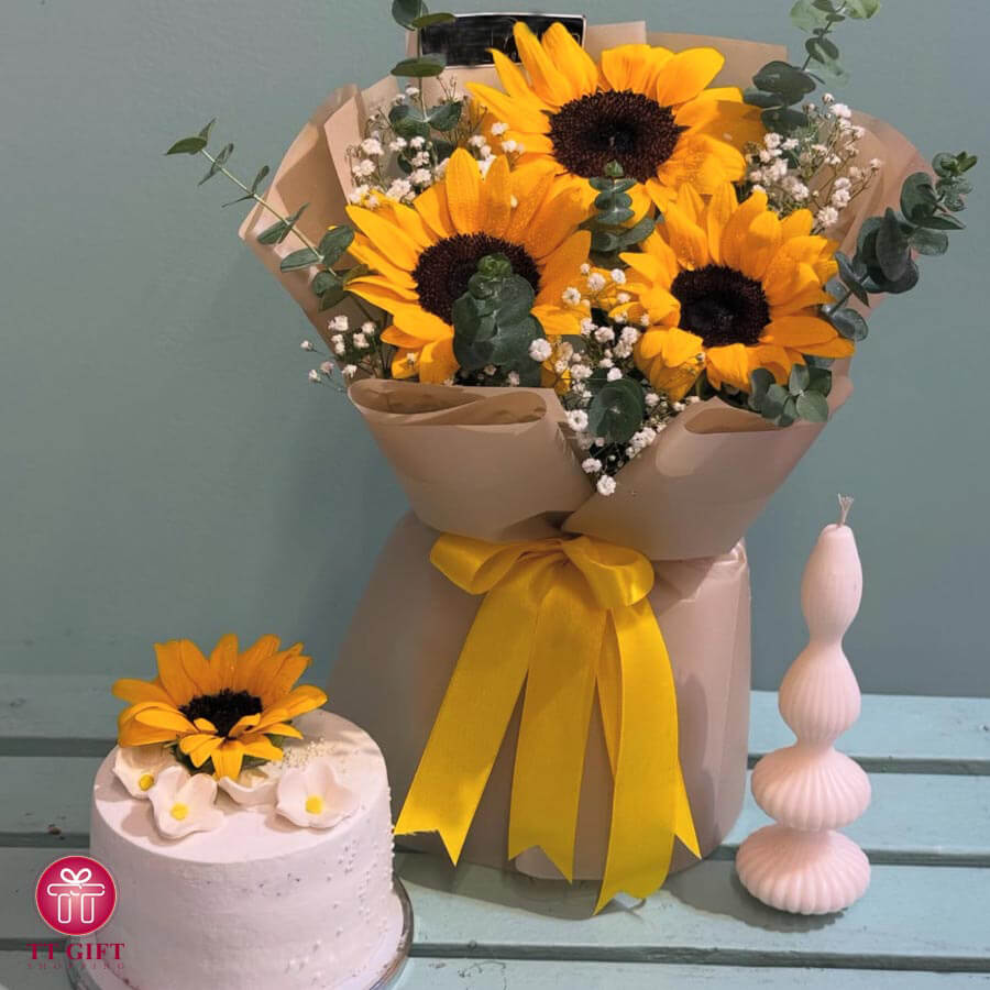با سفارش پکیج کیک و دسته گل آفتاب در تهران و کرج و سایر شهرها ، از خرید هدیه ای خوشمزه لذت ببرید. این پکیج شگفت انگیز شامل کیک خوشمزه و جذاب با وزن تقریبی 1.5 تا 2 کیلوگرم، دسته گل آفتابگردان شامل حدودا 3 شاخه گل مرغوب و زیبا می باشد.